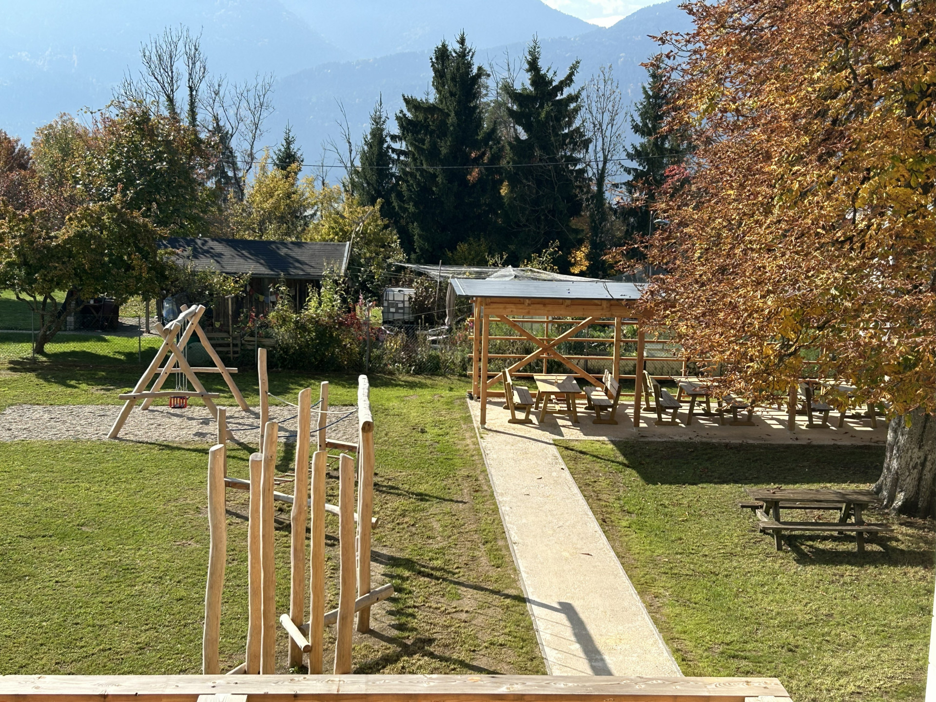 Im Außenbereich (ORE-Förderung) wurde ein Bewegungspark und Kinderspielplatz mit klimaneutralen Holzmöbeln und Blick auf den Dobratsch umgesetzt. Die rund 1.500 m² große Wiese steht für vielfältige Aktivitäten wie Kinderbetreuung im Sommer, Grillfeste, Orientierungsläufe und Langlauf im Winter zur Verfügung.